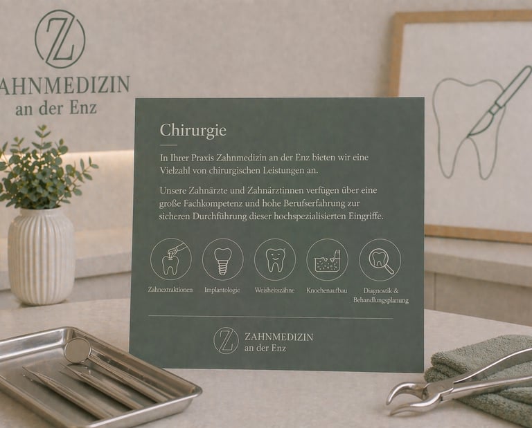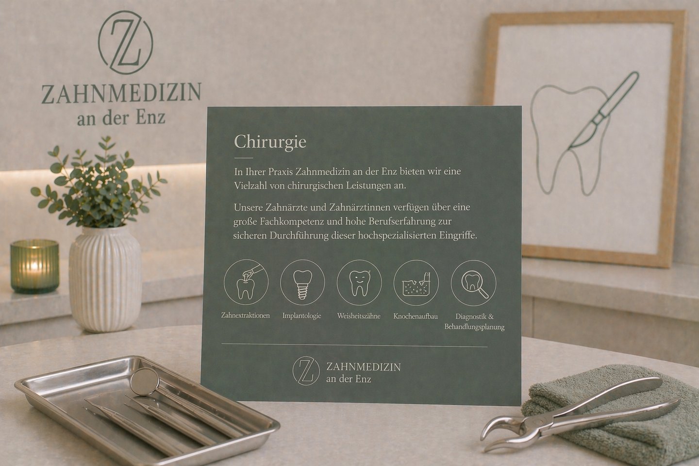 In Ihrer Praxis Zahnmedizin an der Enz bieten wir eine Vielzahl von chirurgischen Leistungen an. Unsere Zahnärzte und Zahnärztinnen verfügen über eine große Fachkompetenz und hohe Berufserfahrung zur sicheren Durchführung dieser hochspezialisierten Eingriffe.